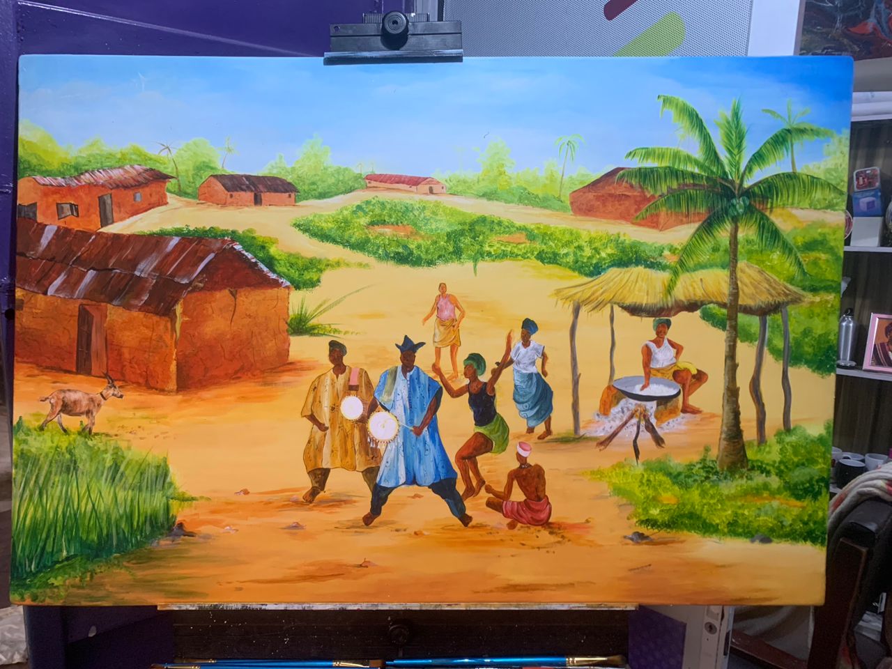 Features a rural scene with people and traditional elements, highlighting culture and community.